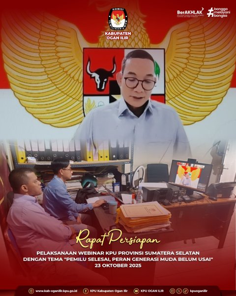 Anggota KPU Kabupaten Ogan Ilir Arbain dan Kasubbag Partisipasi Masyarakat dan SDM Thabrani mengikuti kegiatan zoom meeting Rapat Persiapan Pelaksanaan Webinar KPU Provinsi Sumatera Selatan dengan tema "Pemilu Selesai, Peran Generasi Muda Belum Usai"
