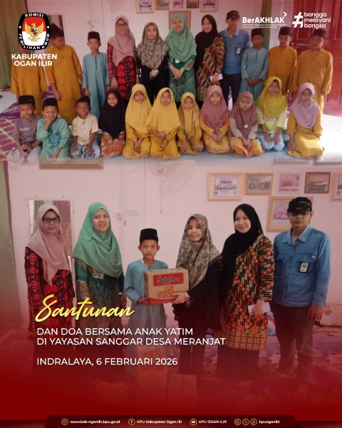 Komisi Pemilihan Umum Kabupaten Ogan Ilir menyerahkan santunan serta melaksanakan doa bersama anak-anak asuh Yayasan Sanggar Desa Meranjat yang diserahkan oleh Sekretaris KPU Kabupaten Ogan Ilir Dian Lestari dan Kasubbag Partisipasi Masyarakat dan SDM Thabrani beserta Staf.