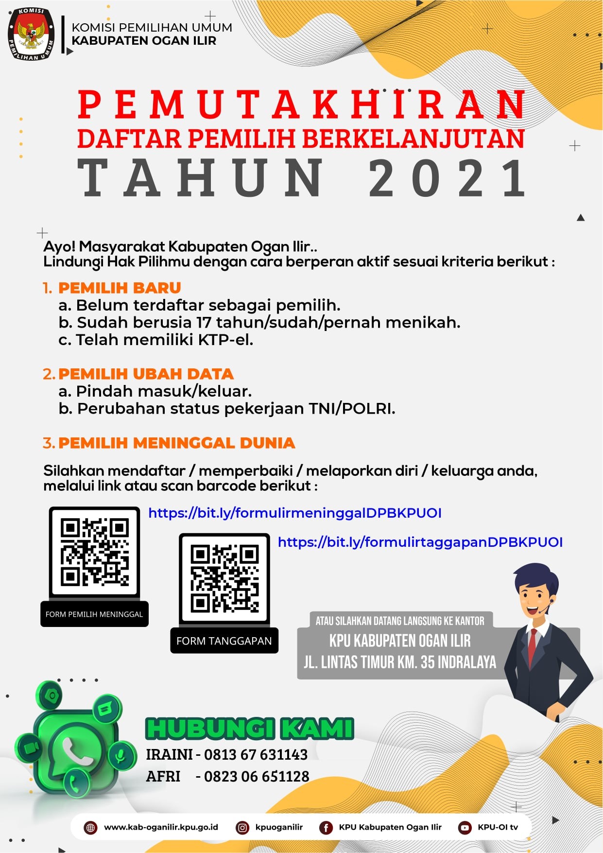 Komisi Pemilihan Umum (KPU) Kabupaten Ogan Ilir membuka layanan Pemutakhiran Daftar Pemilih Berkelanjutan Tahun 2021.