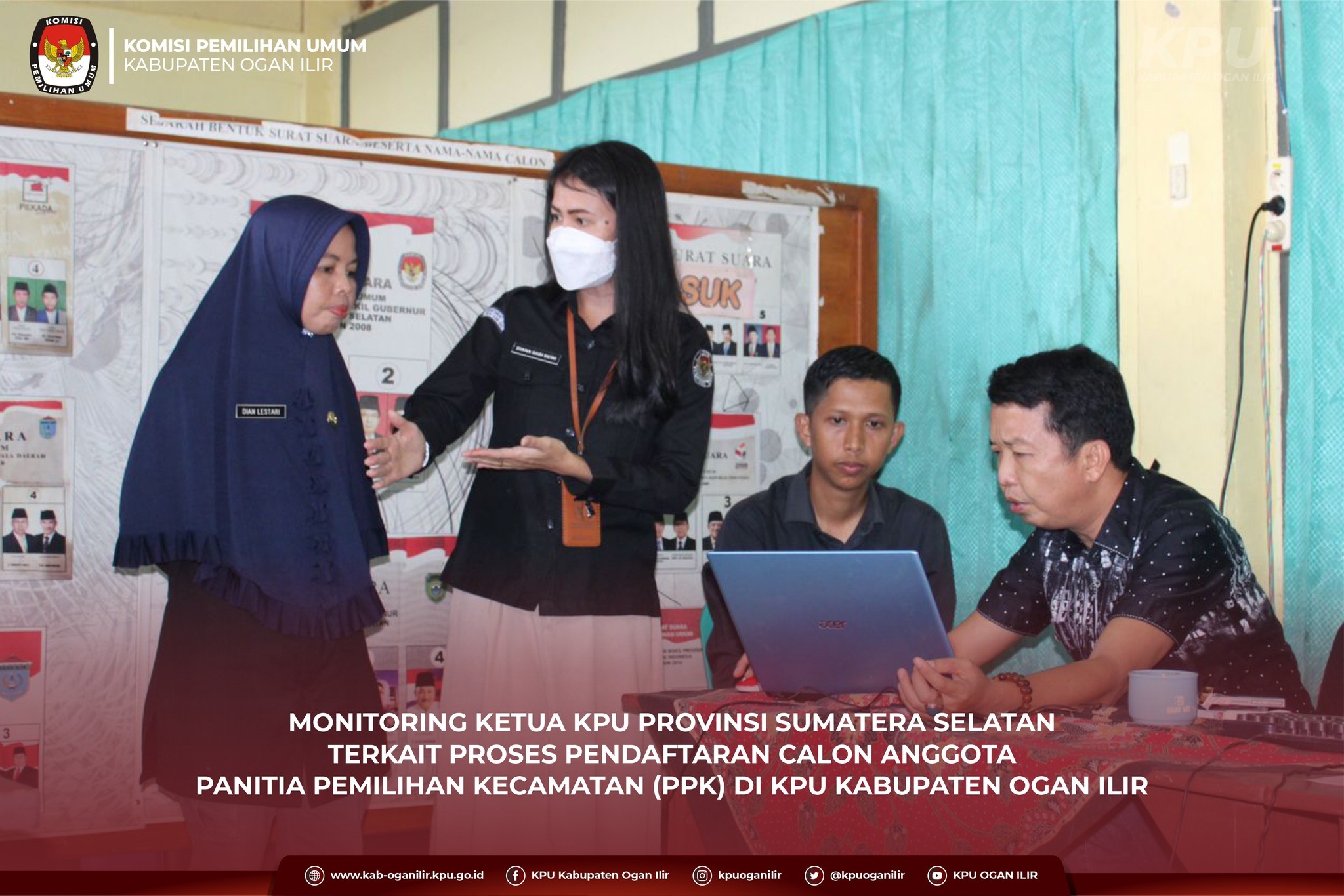 Ketua KPU Provinsi Sumatera Selatan Amrah Muslimin didampingi Kassubag Sumber Daya Manusia Diana Sari berserta Staf. Disambut Sekretaris KPU Kabupaten Ogan Ilir Dian Lestari dan Kasubbag meninjau langsung kegiatan Penelitian Administrasi Pendaftaran Badan Ad Hoc dalam Pemilihan Umum Tahun 2024 di KPU Kabupaten Ogan Ilir.
