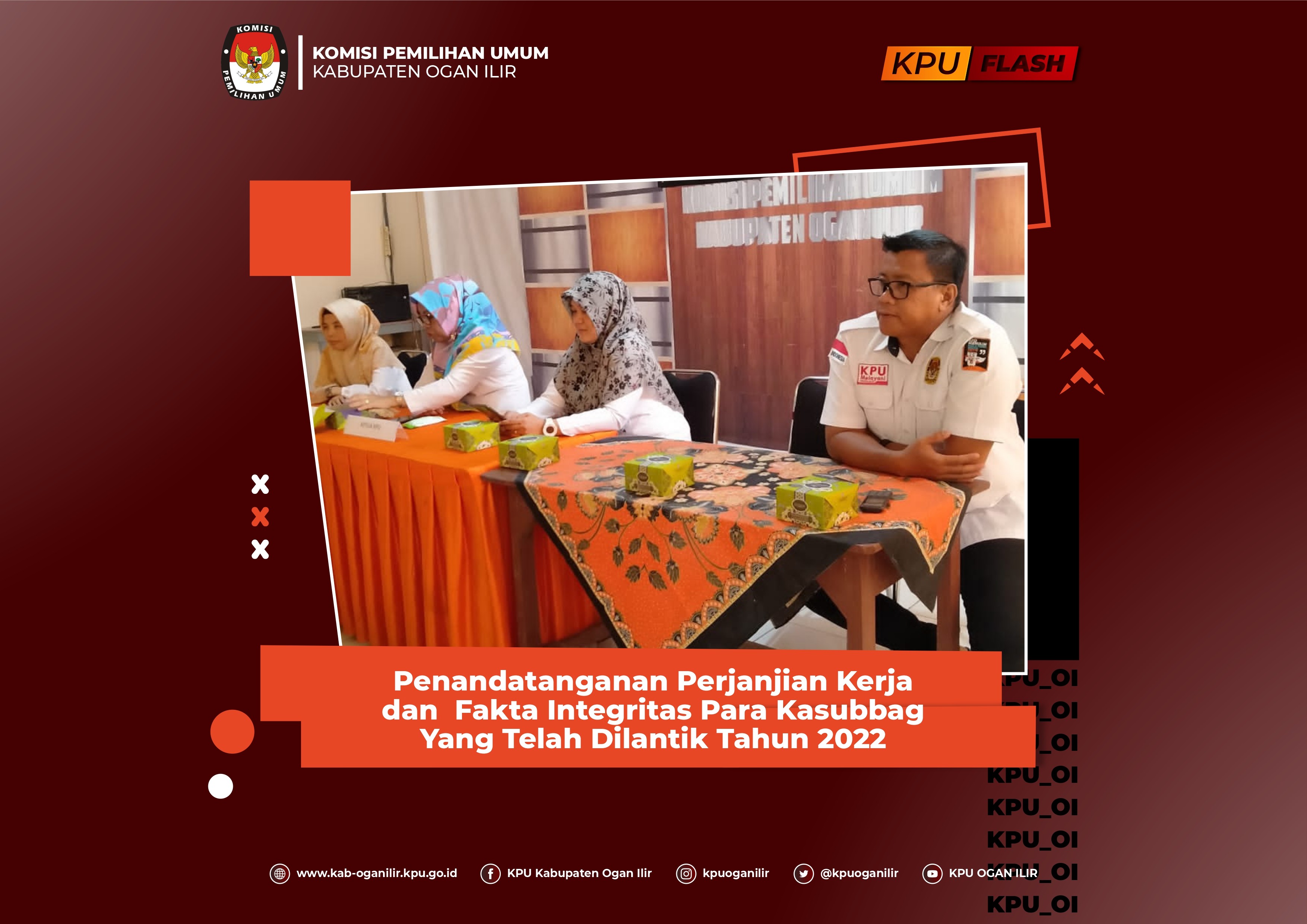 Di ruang Kelas Demokrasi, KPU Kabupaten Ogan Ilir menggelar kegiatan Penandatanganan Perjanjian Kerja dan Fakta Integritas Tahun 2022 kepada para Kasubbag di lingkungan Sekretariat KPU Kabupaten Ogan Ilir yang baru-baru ini telah dilantik dengan disaksikan oleh Ketua KPU Kabupaten Ogan Ilir Massuryati beserta Anggota Titin Maryati dan Rusdi.