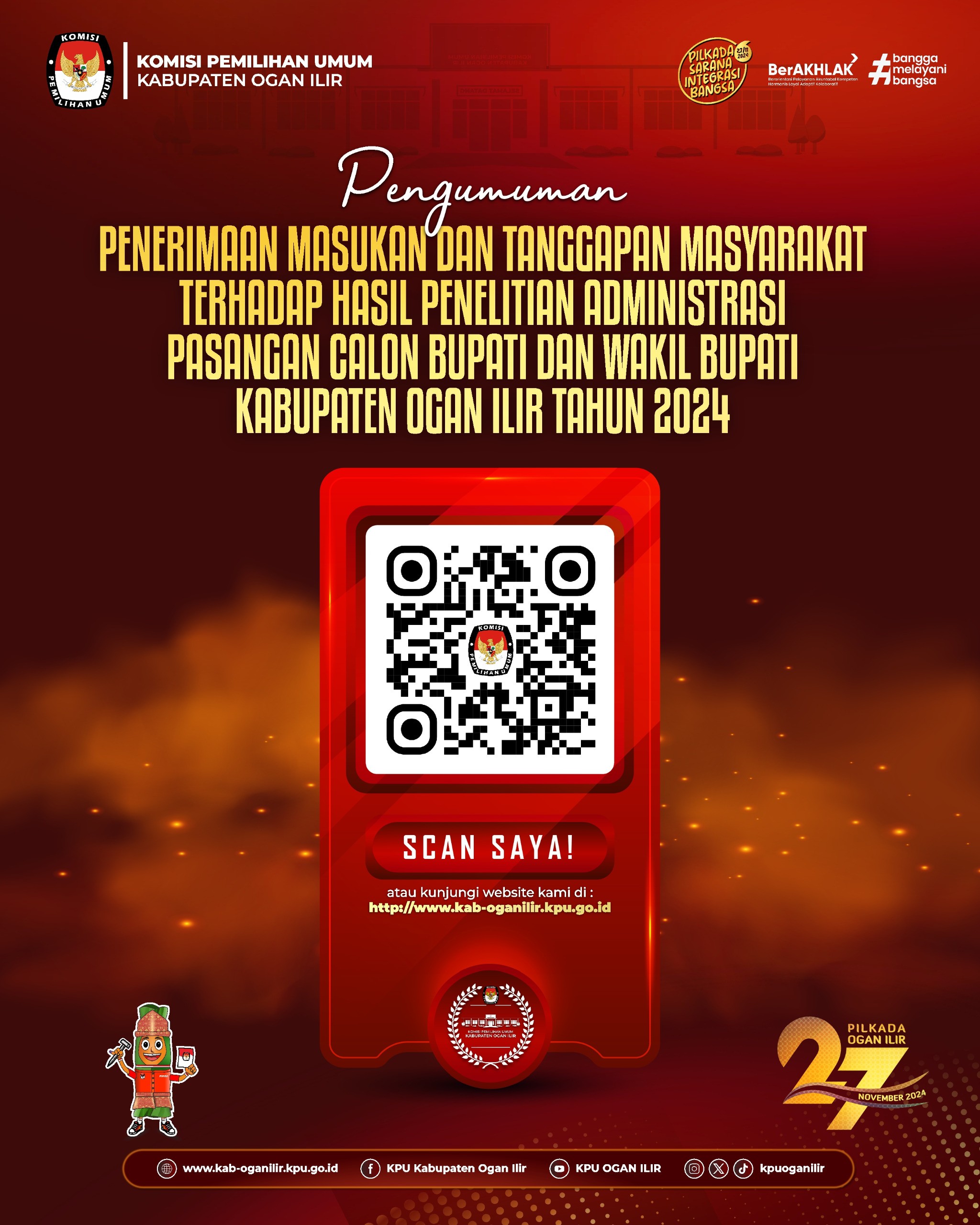 Berikut kami sampaikan Pengumuman Penerimaan Masukan dan Tanggapan Masyarakat terhadap Pasangan Calon Bupati dan Wakil Bupati Kabupaten Ogan Ilir pada Pilkada Serentak Tahun 2024.