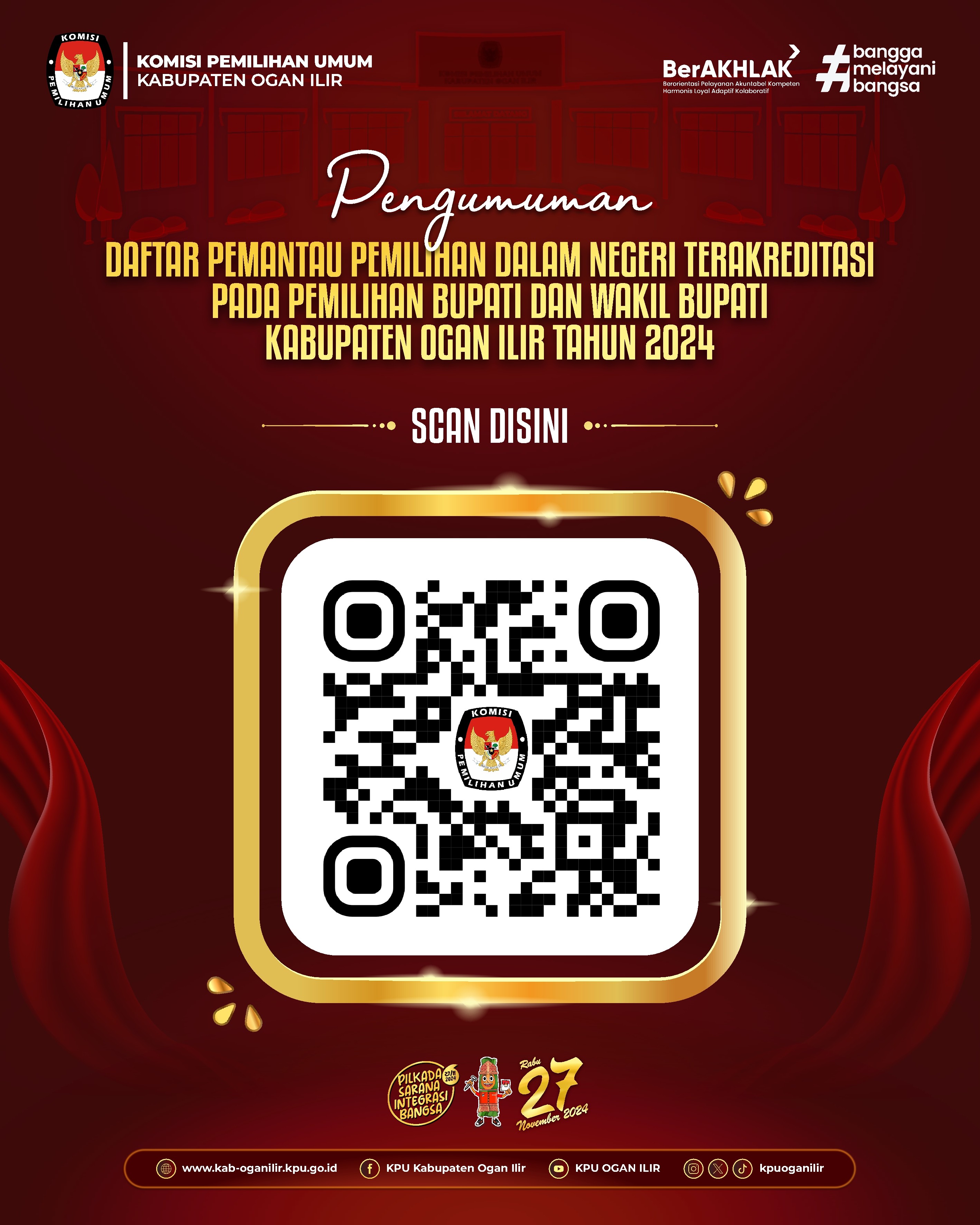 Berikut kami sampaikan Pengumuman Daftar Pemantau Pemilihan Dalam Negeri Terakreditasi pada Pemilihan Bupati dan Wakil Bupati Kabupaten Ogan Ilir Tahun 2024.
