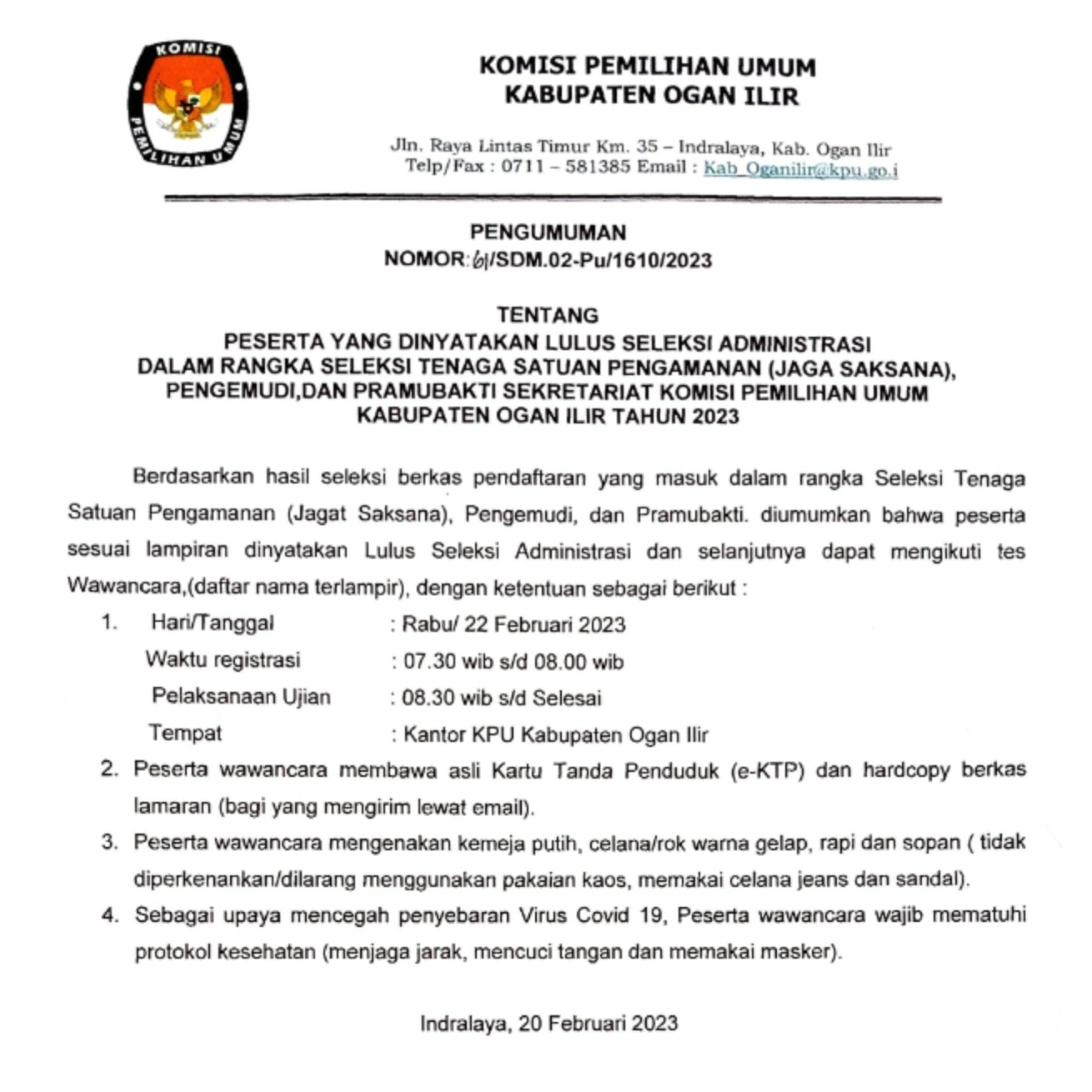 Berdasarkan hasil seleksi administrasi Pendaftaran Tenaga Satuan Pengamanan, Pengemudi dan Pramubakti Di sekretariat KPU Kabupaten Ogan Ilir dengan ini kami sampaikan Pengumuman nama-nama yang selanjutnya akan mengikuti Seleksi Wawancara, sebagai berikut :