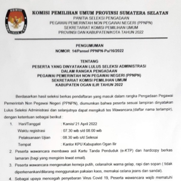 Pengumuman Hasil Seleksi Administrasi PPNPN di Sekretariat KPU Kabupaten Ogan Ilir