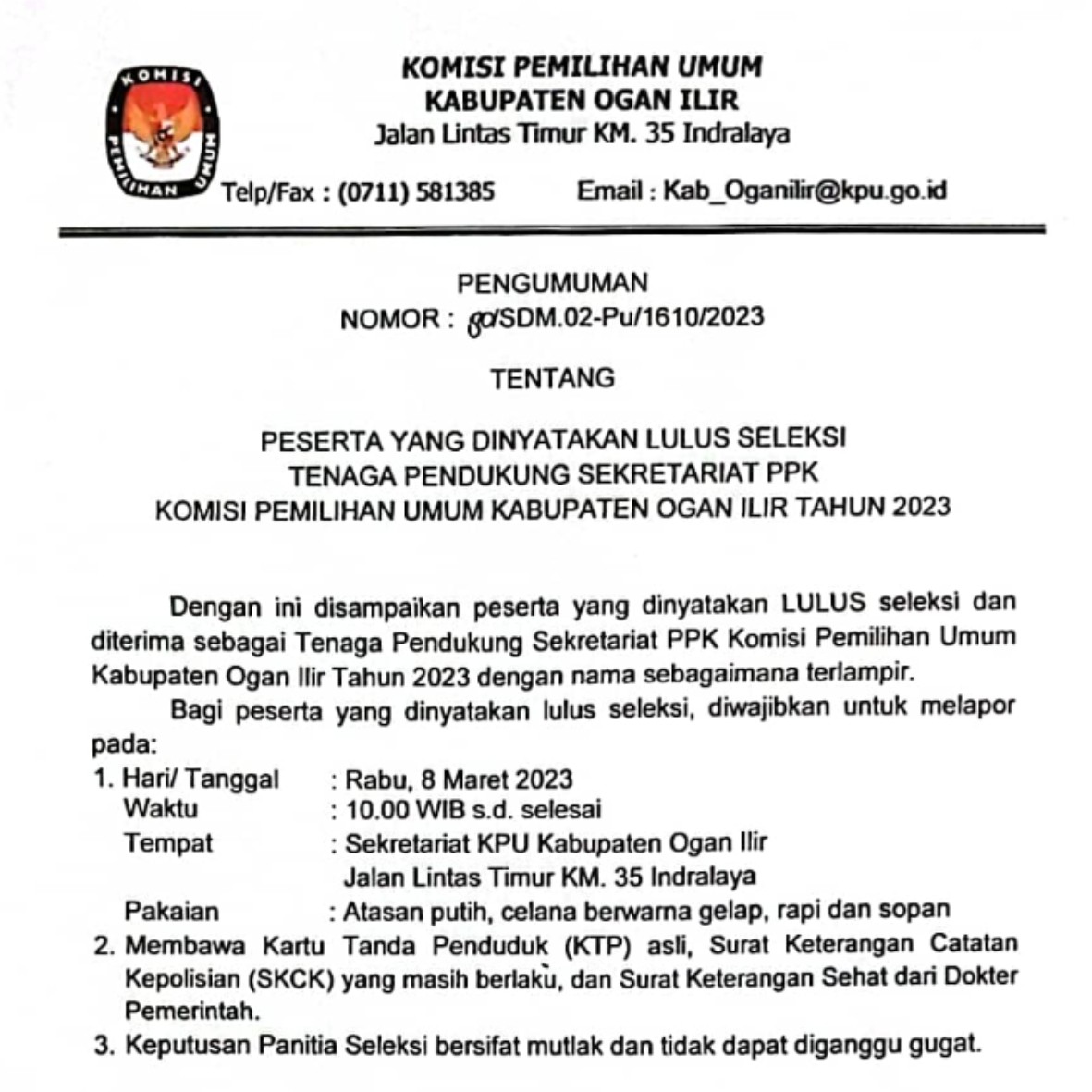 Pengumuman Hasil Seleksi Tenaga Pendukung Sekretariat Panitia Pemilihan Kecamatan (PPK) di Kabupaten Ogan Ilir
