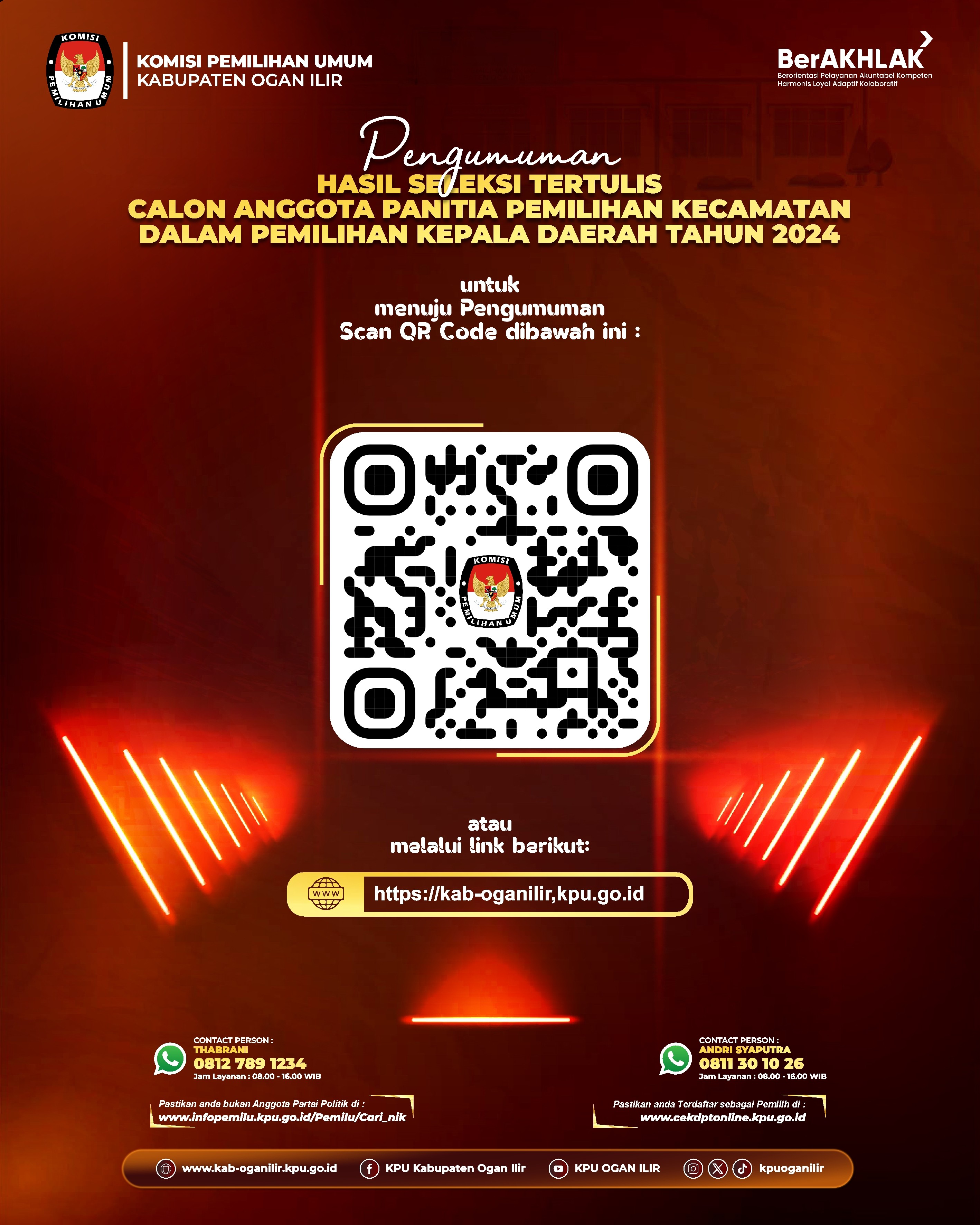 Komisi Pemilihan Umum Kabupaten Ogan Ilir dengan ini mengumumkan Hasil Seleksi Tertulis dengan Metode Computer Assisted Test (CAT) Calon Anggota Panitia Pemilihan Kecamatan pada Pemilihan Kepala Daerah Tahun 2024.