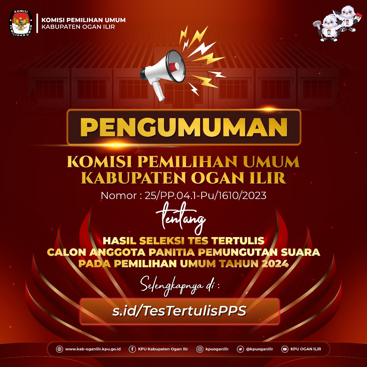 Komisi Pemilihan Umum Kabupaten Ogan Ilir dengan ini mengumumankan Hasil Seleksi Tertulis Calon Anggota Panitia Pemungutan Suara (PPS) pada Pemilihan Umum Tahun 2024, Silahkan klik tautan berikut untuk mengunduh Pengumuman.