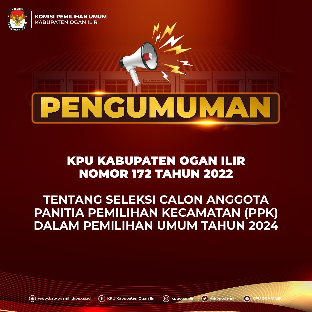 KPU Kabupaten Ogan Ilir mengundang putra-putri terbaik sebagai warga negara indonesia untuk mengikuti seleksi penerimaan calon anggota Panitia Pemilihan Kecamatan (PPK) pada Pemilihan Umum Tahun 2024.