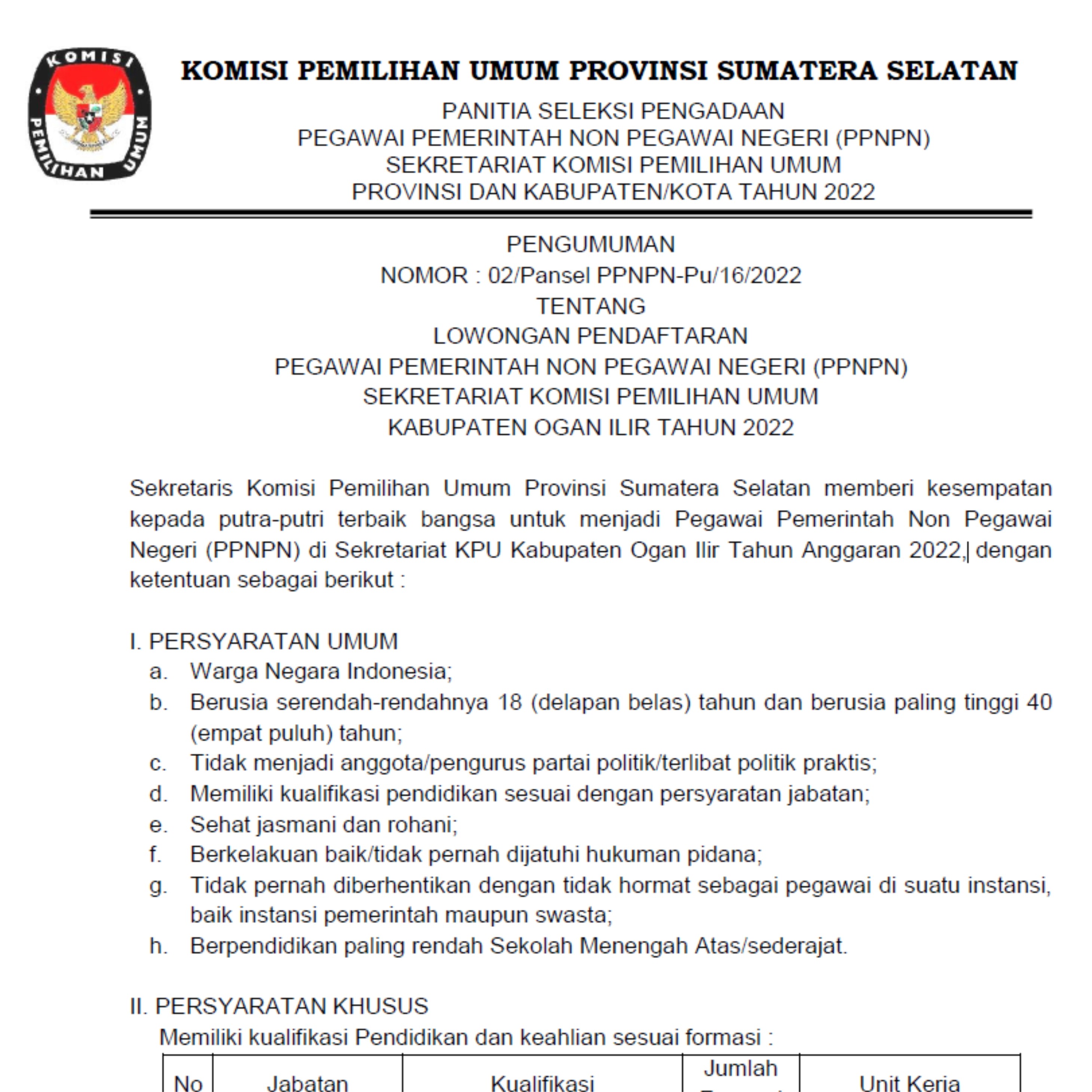Sekretaris Komisi Pemilihan Umum Provinsi Sumatera Selatan memberi kesempatan kepada putra-putri terbaik bangsa untuk menjadi Pegawai Pemerintah Non Pegawai Negeri (PPNPN) di Lingkungan Sekretariat KPU Kabupaten Ogan Ilir Tahun Anggaran 2022.