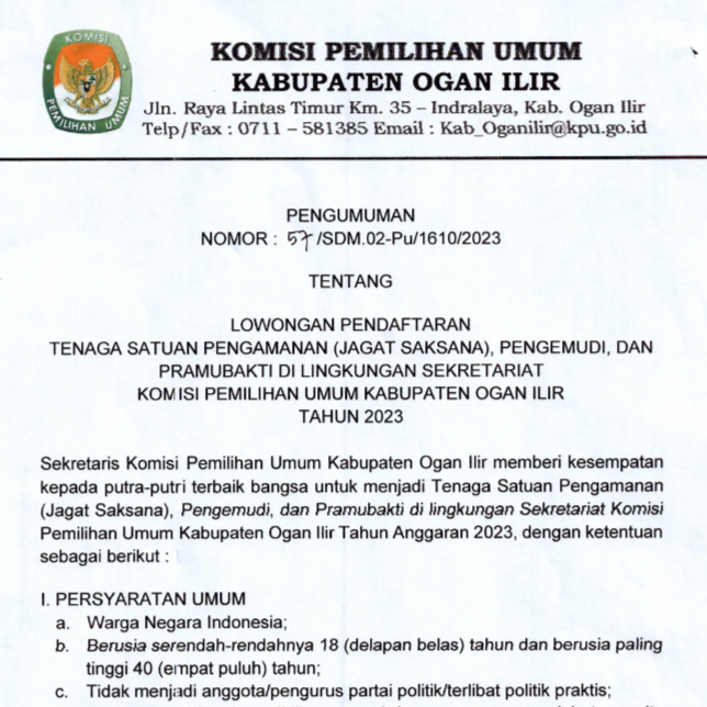 Pengumuman Penerimaan Tenaga Satuan Pengamanan, Pengemudi dan Pramubakti Di sekretariat KPU Kabupaten Ogan Ilir
