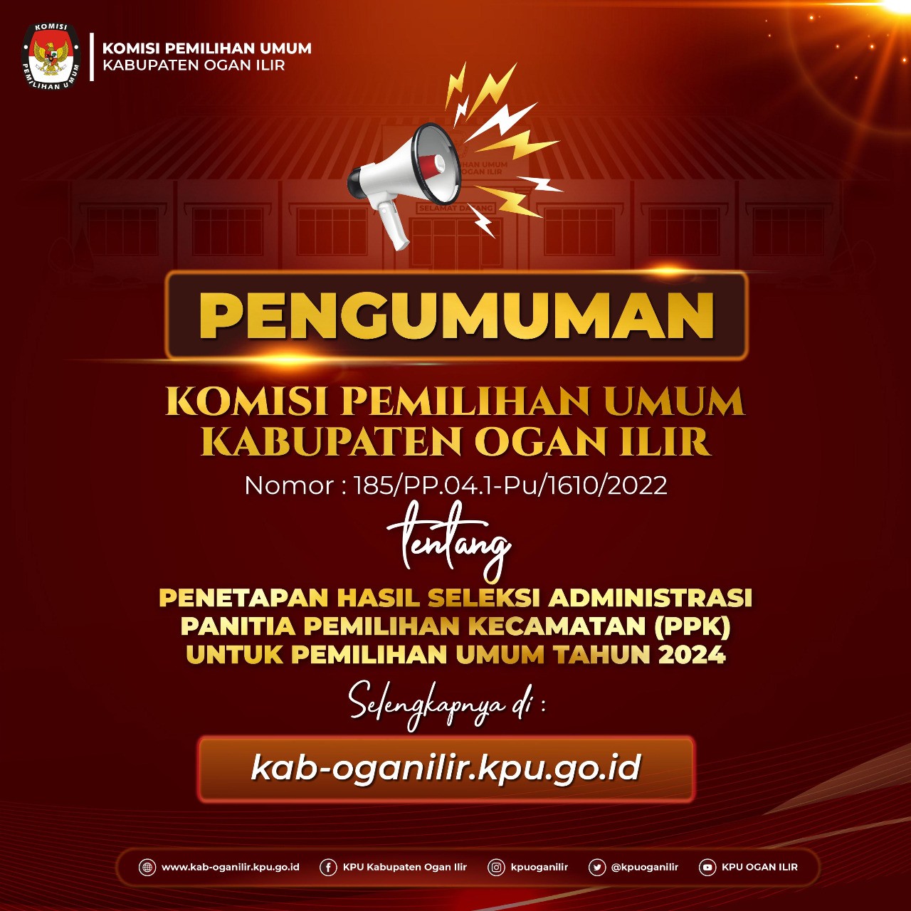 Setelah melewati tahapan Pendaftaran Badan Add Hoc dalam Pemilihan Umum Tahun 2024 dengan ini Komisi Pemilihan Umum Kabupaten Ogan Ilir mengumumkan Penetapan Hasil Seleksi Administrasi Panitia Pemilihan Kecamatan (PPK) dalam Pemilihan Umum Tahun 2024 pada tautan di bawah ini :