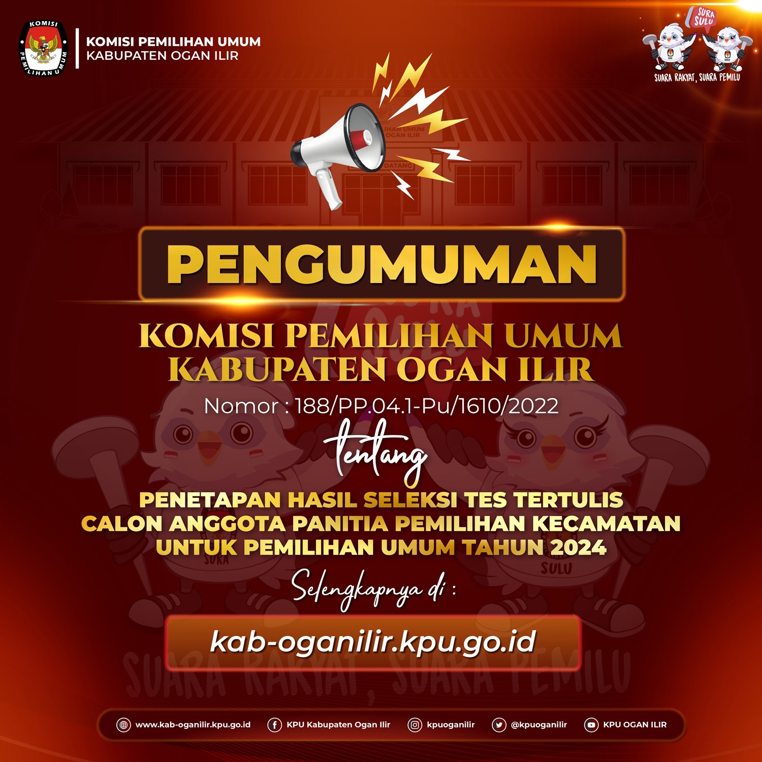 Komisi Pemilihan Umum Kabupaten Ogan Ilir dengan ini mengumumkan Penetapan Hasil Seleksi Tes Tertulis Calon Anggota Panitia Pemilihan Kecamatan (PPK) dalam Pemilihan Umum Tahun 2024 pada tautan di bawah ini :