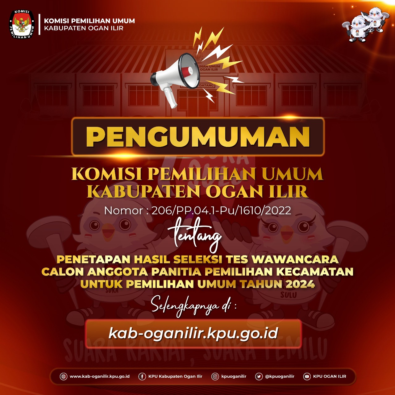 Hai #TemanPemilih setelah melewati tahapan-tahapan serta proses panjang untuk mencapai tahap akhir, dengan ini KPU Kabupaten Ogan Ilir mengumumkan Penetapan Hasil Seleksi Test Wawancara Calon Anggota Panitia Pemilihan Kecamatan (PPK) untuk Pemilihan Umum Tahun 2024.