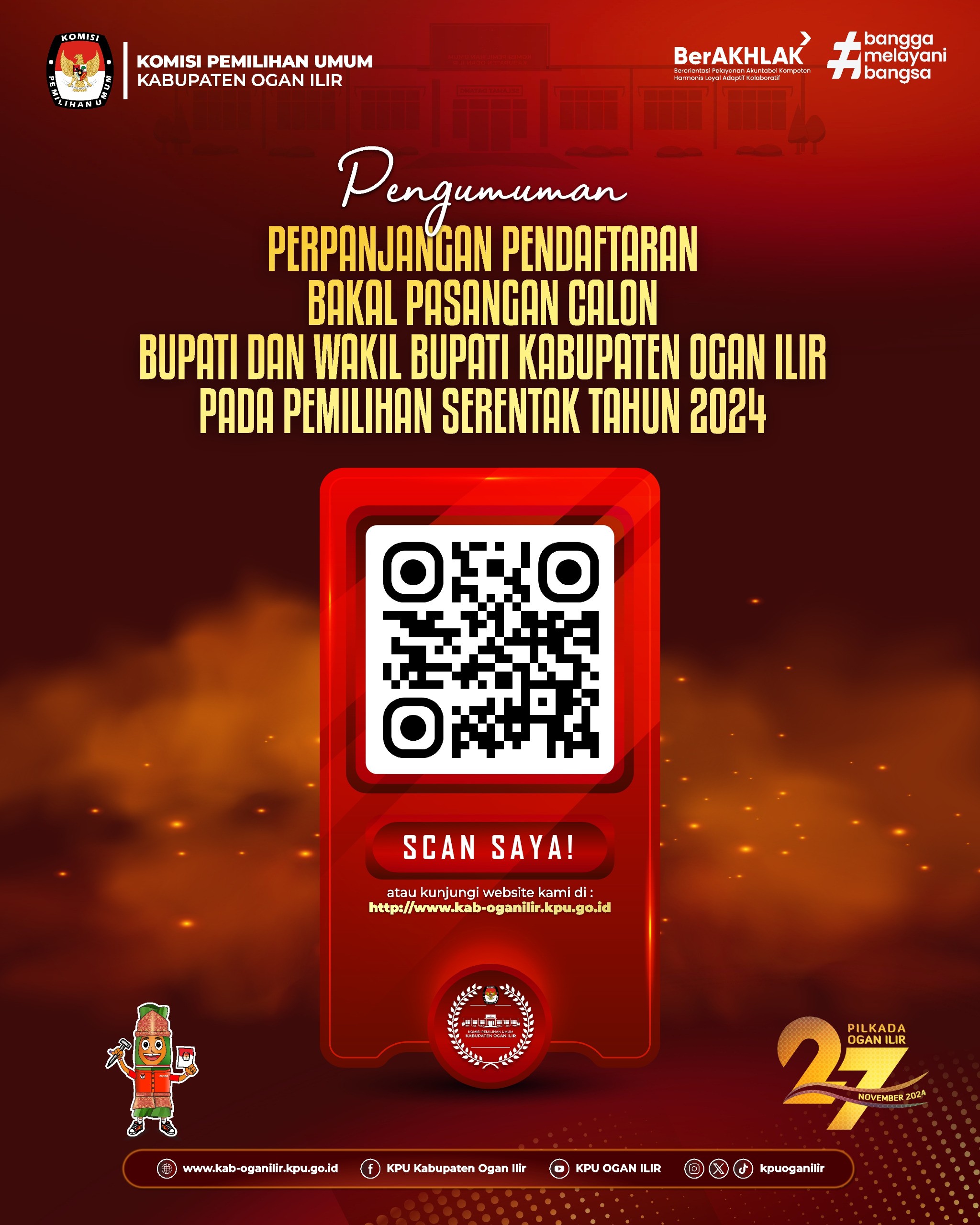 Dengan ini kami sampaikan Pengumuman Perpanjangan Pendaftaran Bakal Pasangan Calon Bupati dan Wakil Bupati Kabupaten Ogan Ilir Tahun 2024, berdasarkan Peraturan Komisi Pemilihan Umum Nomor 10 Tahun 2024 dan Keputusan Komisi Pemilihan Umum Nomor 1229 Tahun 2024.