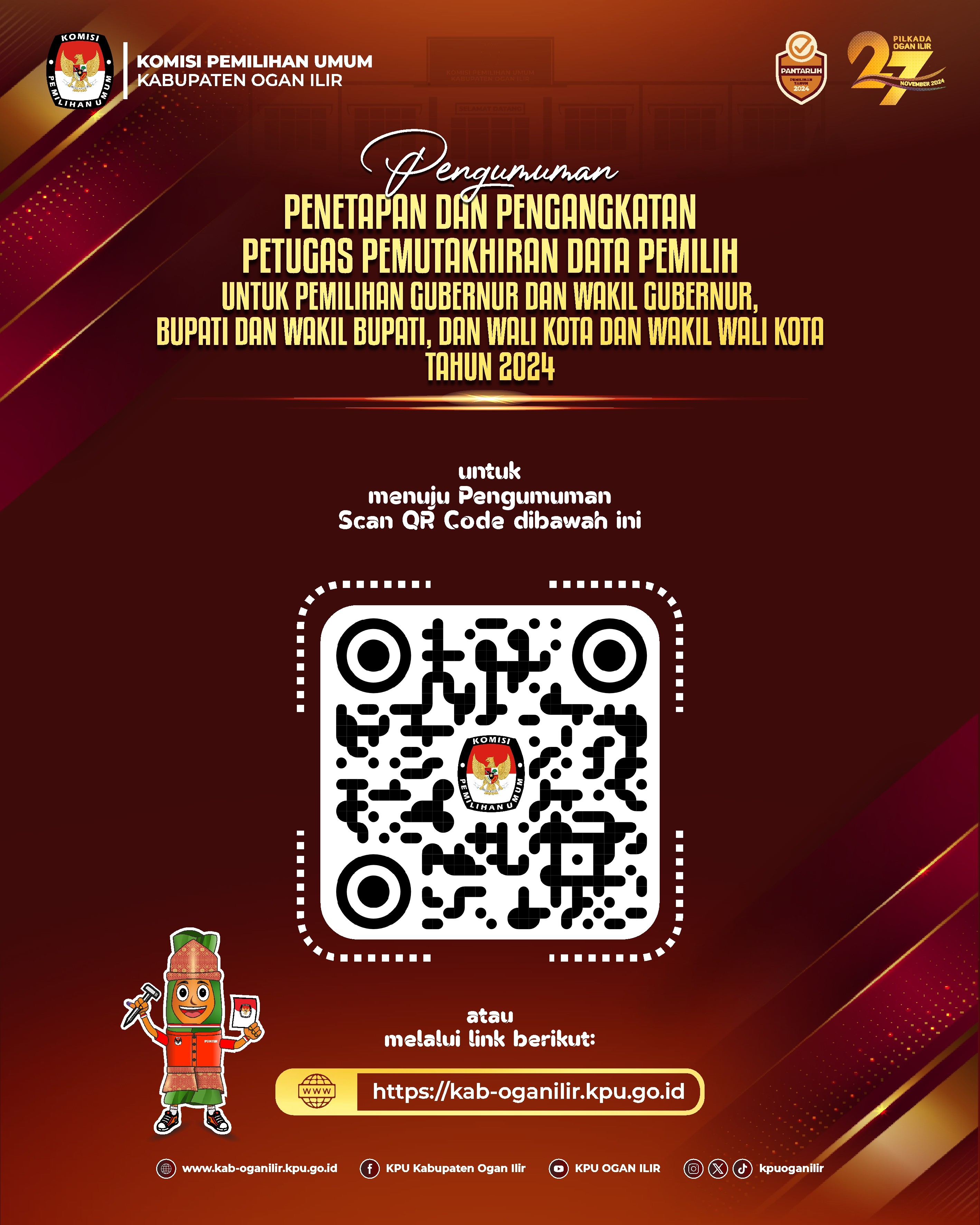 Berikut kami sampaikan Pengumuman Petugas Pemutakhiran Data Pemilih untuk Pemilihan Gubernur dan Wakil Gubernur, Bupati dan Wakil Bupati, dan WaliKota dan Wakil Walikota Tahun 2024 di Kabupaten Ogan Ilir.