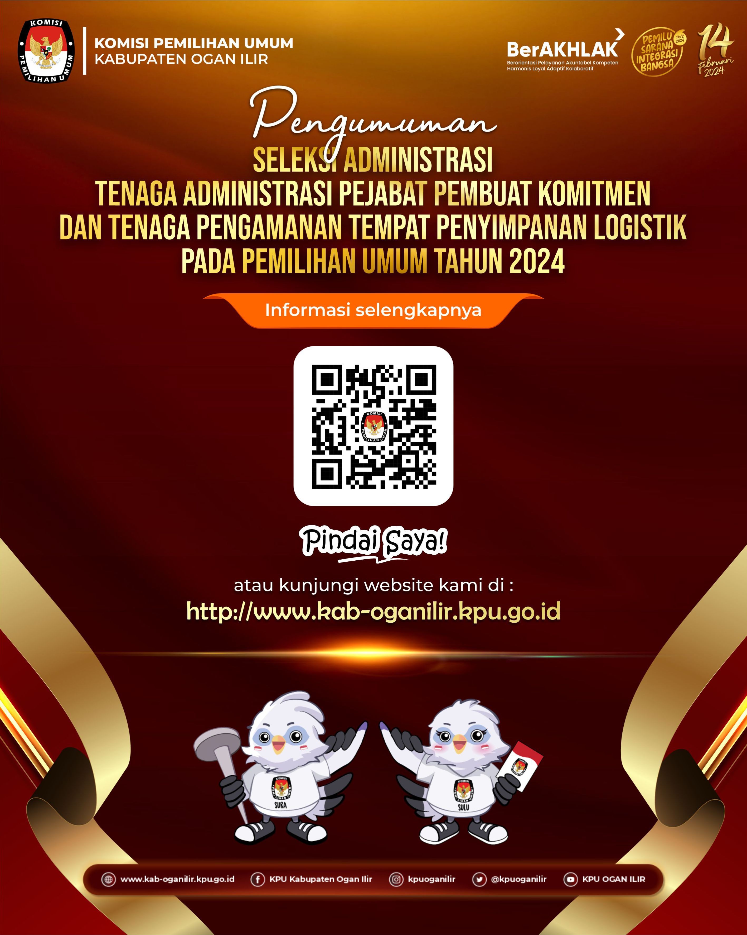 Komisi Pemilihan Umum Kabupaten Ogan Ilir dengan ini mengumumkan Hasil Seleksi Administrasi Tenaga Administrasi Pejabat Pembuat Komitmen dan Tenaga Pengamanan Tempat Penyimpanan Logistik pada Pemilihan Umum Tahun 2024 dan selanjutnya akan mengikuti pelaksanaan Seleksi Wawancara berikut jadwal dan ketentuan yang tertera pada Pengumuman.