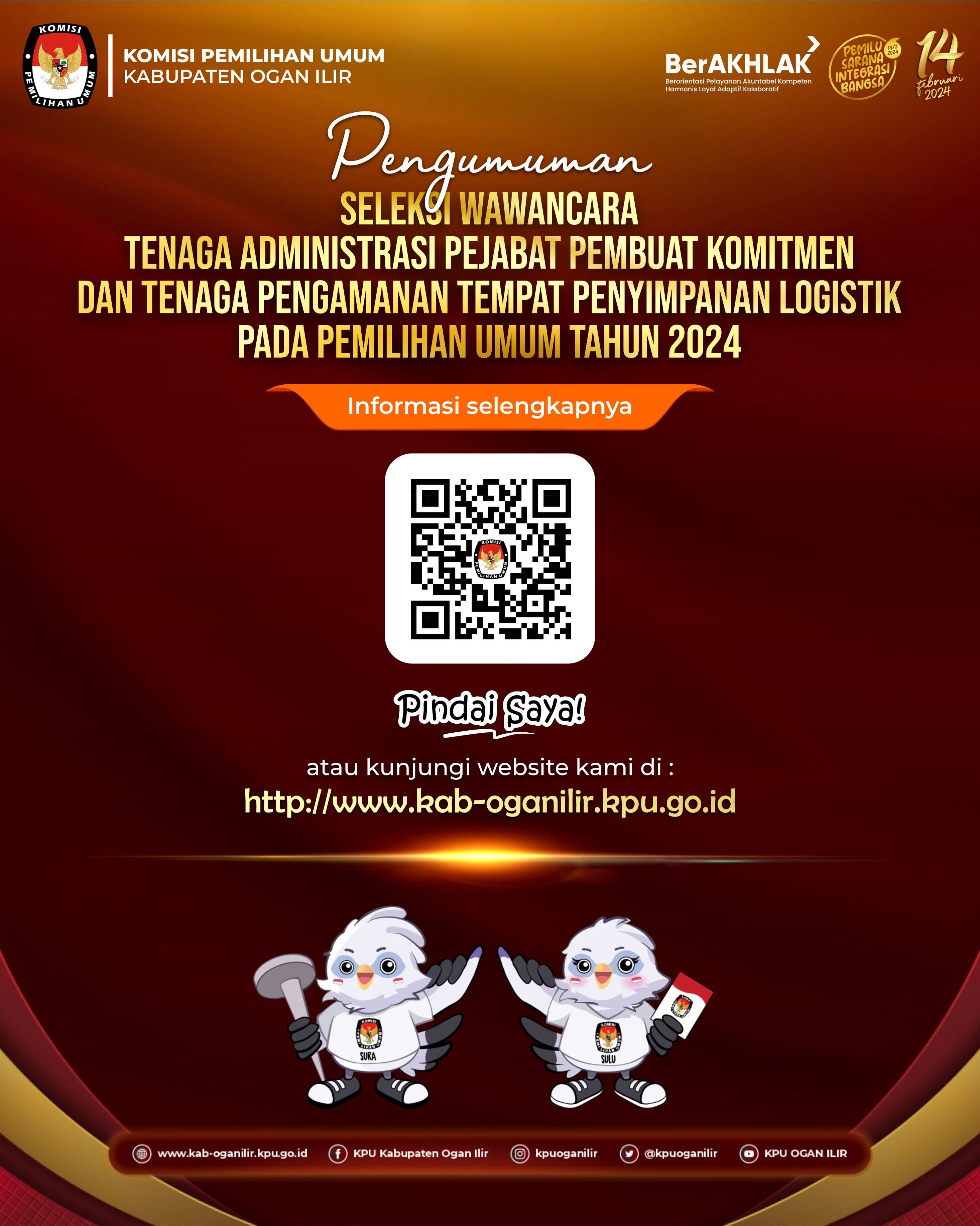 Komisi Pemilihan Umum Kabupaten Ogan Ilir dengan ini mengumumkan Hasil Seleksi Wawancara Tenaga Administrasi Pejabat Pembuat Komitmen dan Tenaga Pengamanan Logistik pada Pemilihan Umum Tahun 2024 dan dinyatakan "LULUS" seleksi tertuang dalam Pengumuman sebagai berikut.