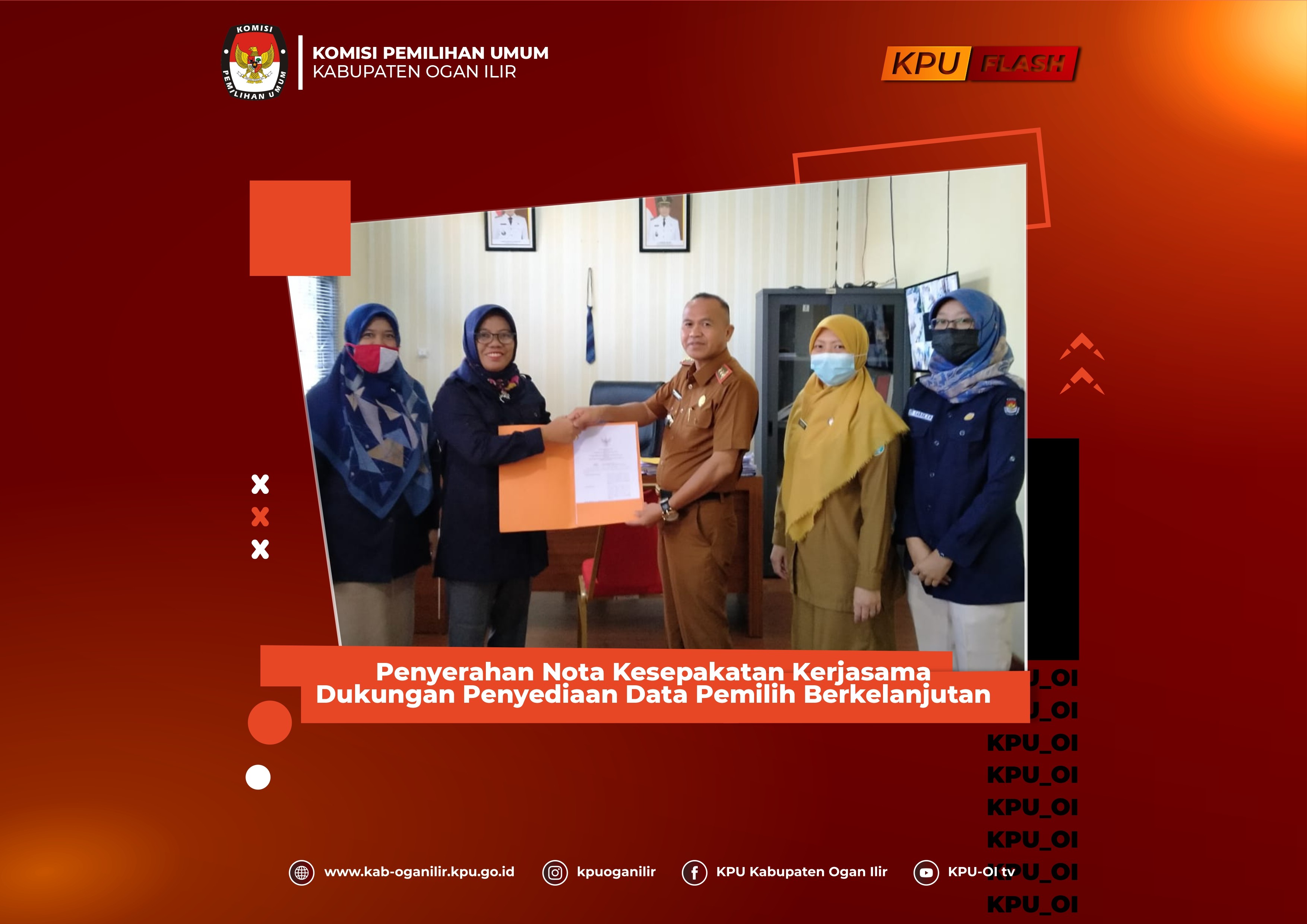 Ketua Komisi Pemilihan Umum (KPU) Kabupaten Ogan Ilir Massuryati didampingi Anggota Divisi Perencanaan Data dan Informasi Titin Maryati beserta Plt Kasubbag Program dan Data Siti Sarah melaksanakan Rapat Koordinasi antara Pemerintah Kabupaten Ogan Ilir menyerahkan Nota Kesepakatan tentang Kerjasama Dukungan Penyediaan Data Pemilih Berkelanjutan yang diterima oleh Plt Kepala Dinas Kependudukan dan Catatan Sipil Zaidan dan Kepala Bidang Pemanfaatan Data dan Inovasi Pelayanan Damayanti.
