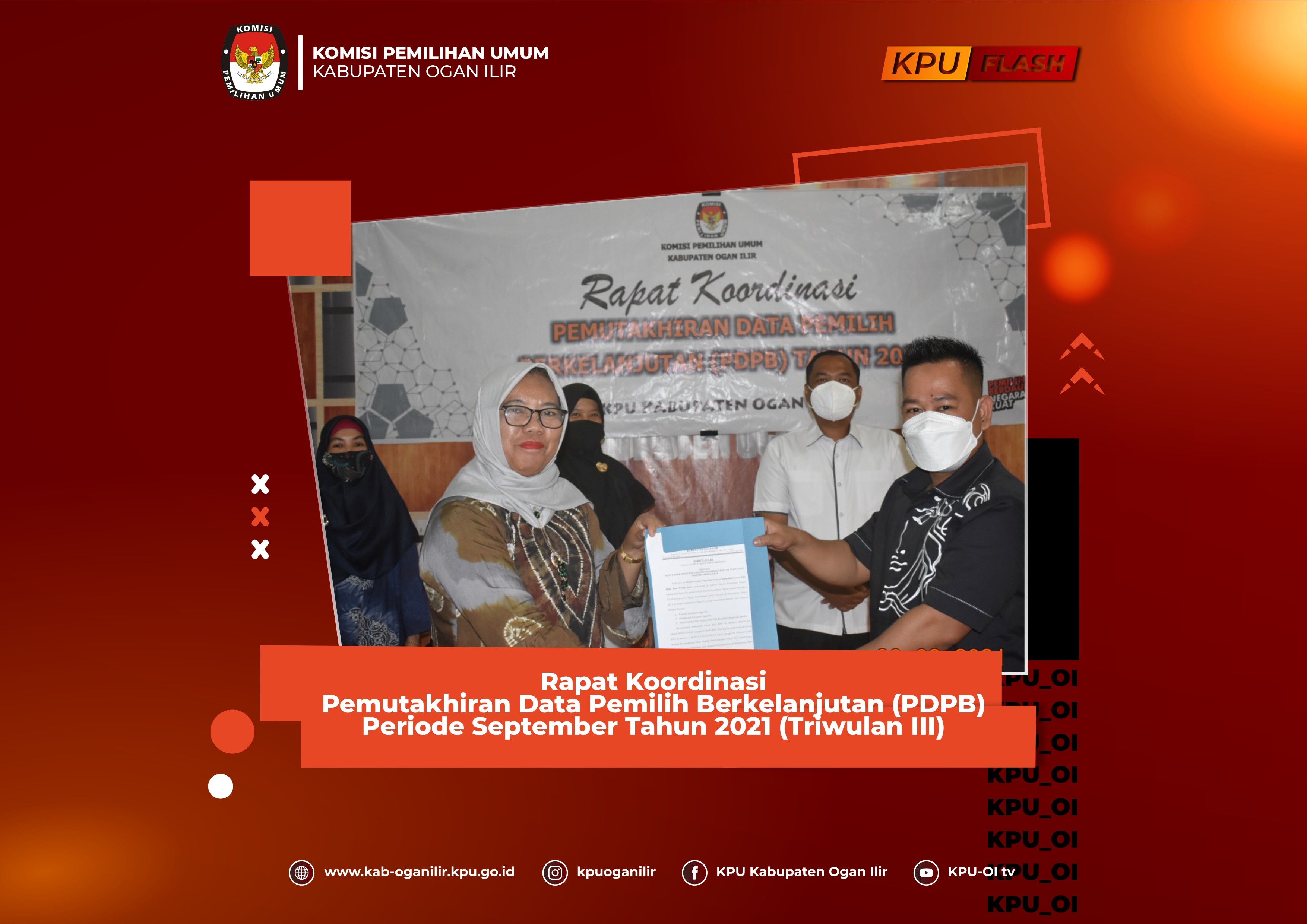 Komisi Pemilihan Umum (KPU) Kabupaten Ogan Ilir melaksanakan Rapat Koordinasi Pemutakhiran Data Pemilih Berkelanjutan (PDPB) Periode Bulan September Tahun 2021 atau Triwulan III Tahun 2021, bertempat di Ruang Rapat Kantor KPU Kabupaten Ogan Ilir.