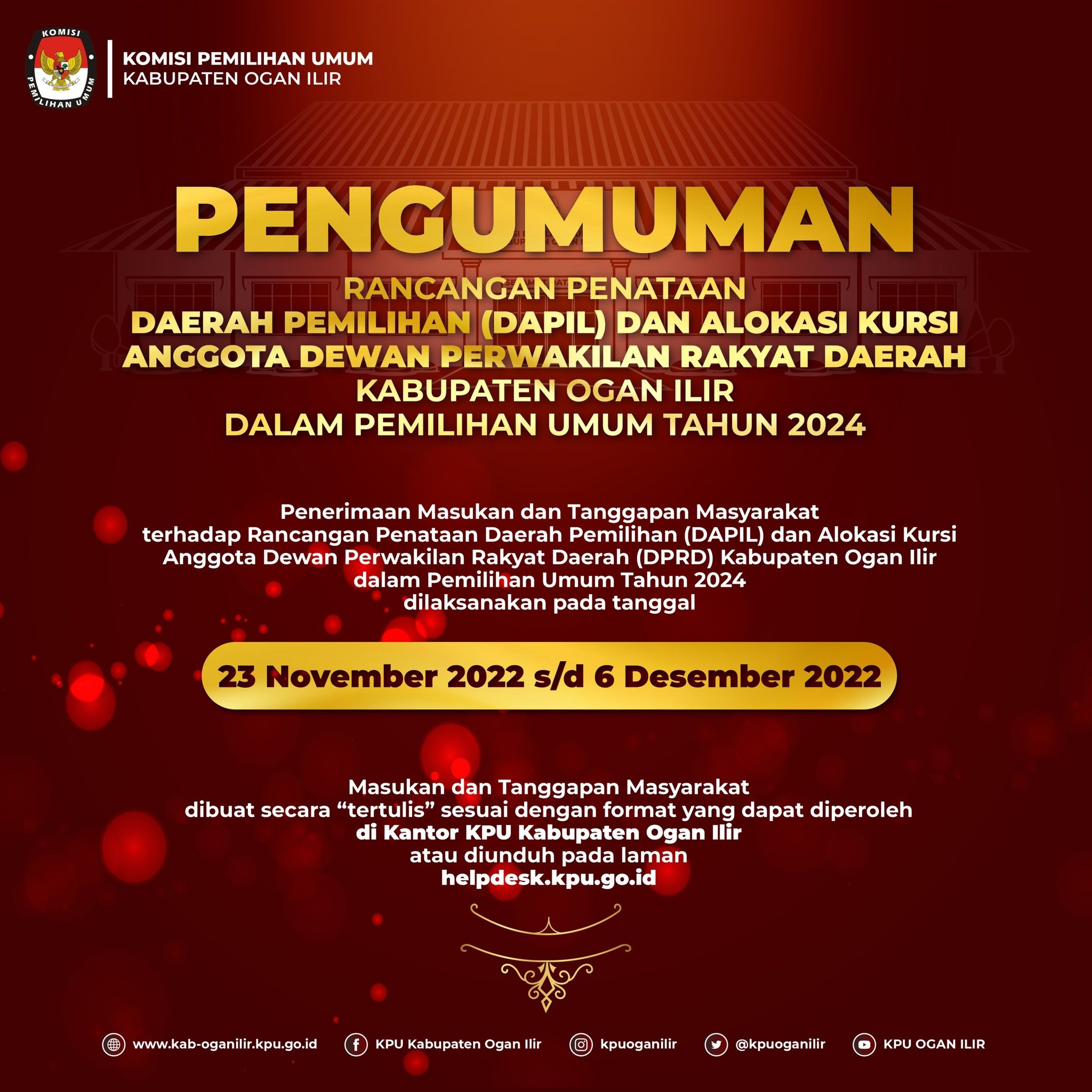 Berdasarkan pada Berita Acara Komisi Pemilihan Umum Kabupaten Ogan Ilir Nomor 60 tahun 2022 tentang Rancangan Penataan Daerah Pemilihan (DAPIL) dan Alokasi Kursi Anggota Dewan Perwakilan Rakyat Daerah (DPRD) Kabupaten Ogan Ilir dalam Pemilihan Umum Tahun 2024.