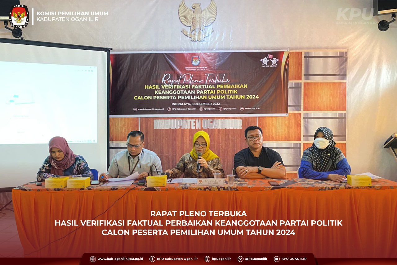 KPU Kabupaten Ogan Ilir menggelar Rapat Pleno Terbuka Hasil Verifikasi Faktual Perbaikan Calon Peserta Pemilihan Umum Tahun 2024 dengan dihadiri dari Bawaslu Kabupaten Ogan Ilir serta Pengurus DPD Partai Solidaritas Indonesia (PSI).