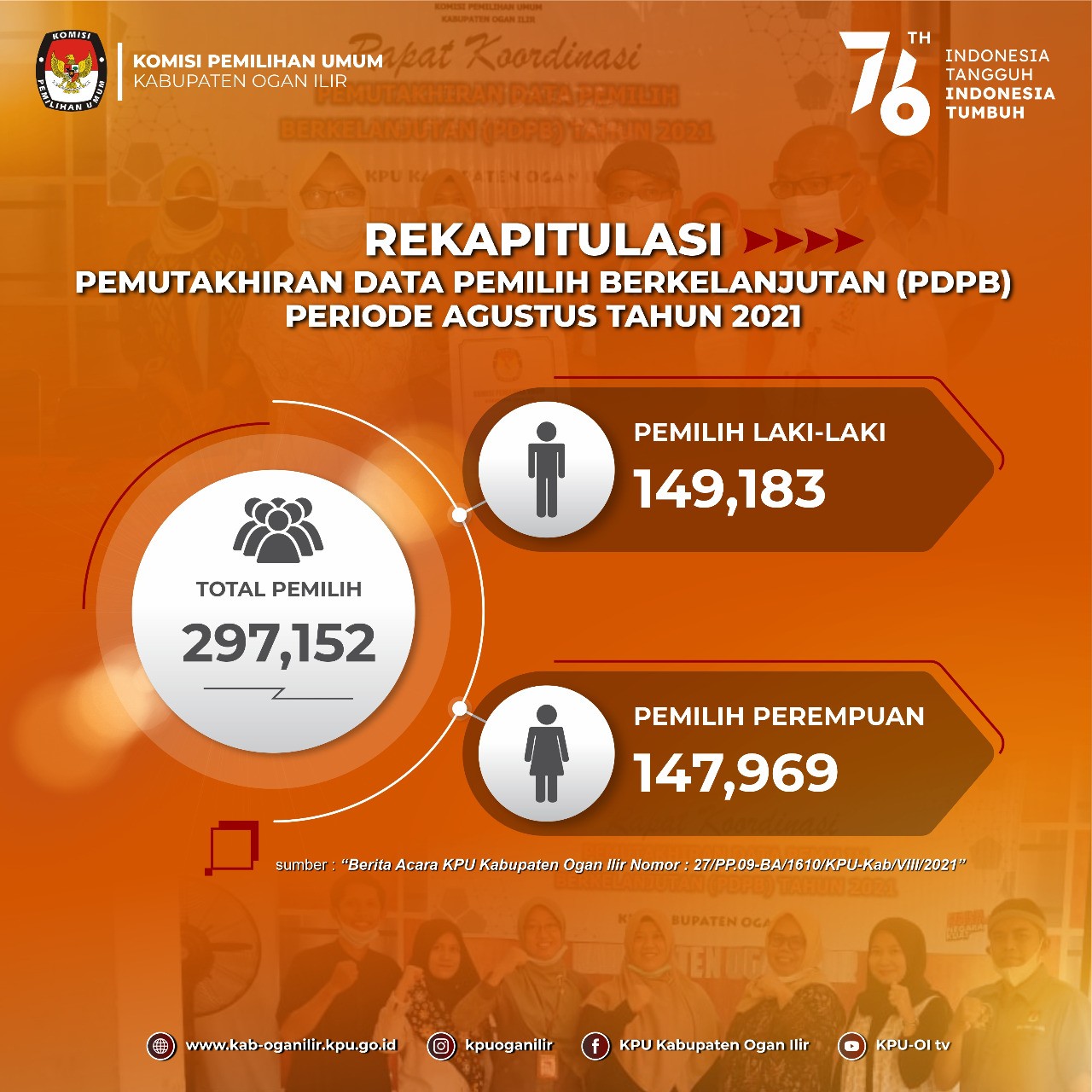 Dengan hasil Rapat Koordinasi yang dilakukan KPU Kabupaten Ogan Ilir menghasilkan Daftar Pemilih Berkelanjutan dengan jumlah 297,152 pemilih diantaranya adalah Laki-laki berjumlah 149,183 pemilih dan Perempuan berjumlah 147,969 pemilih.