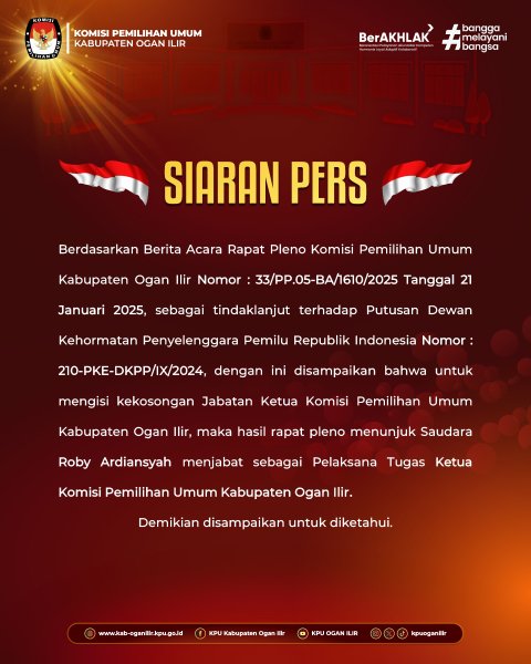 Berdasarkan Berita Acara Rapat Pleno Komisi Pemilihan Umum Kabupaten Ogan Ilir Nomor : 33/PP.05-BA/1610/2025 Tanggal 21 Januari 2025, sebagai tindaklanjut terhadap Putusan Dewan Kehormatan Penyelenggara Pemilu Republik Indonesia Nomor : 210-PKE-DKPP/IX/2024.