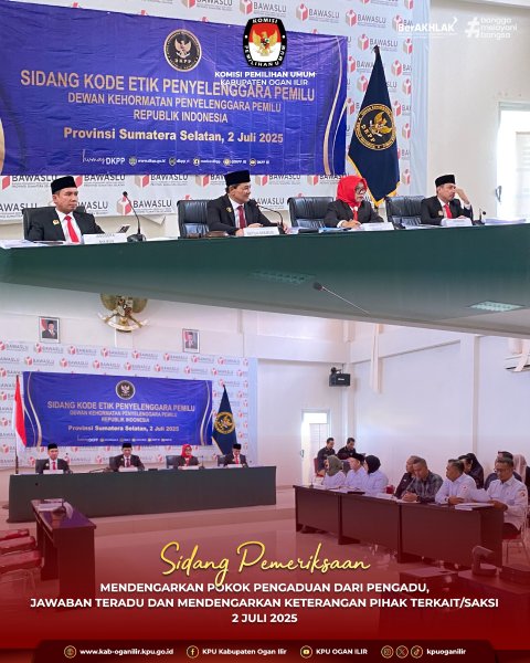 Ketua KPU Kabupaten Ogan Ilir Roby Ardiansyah dan Anggota Rusdi didampingi Anggota KPU Provinsi Sumsel Handoko menghadiri Sidang Pemeriksaan yang digelar Dewan Kehormatan Penyelenggara Pemilihan Umum (DKPP) diruang sidang Bawaslu Provinsi Sumatera Selatan.