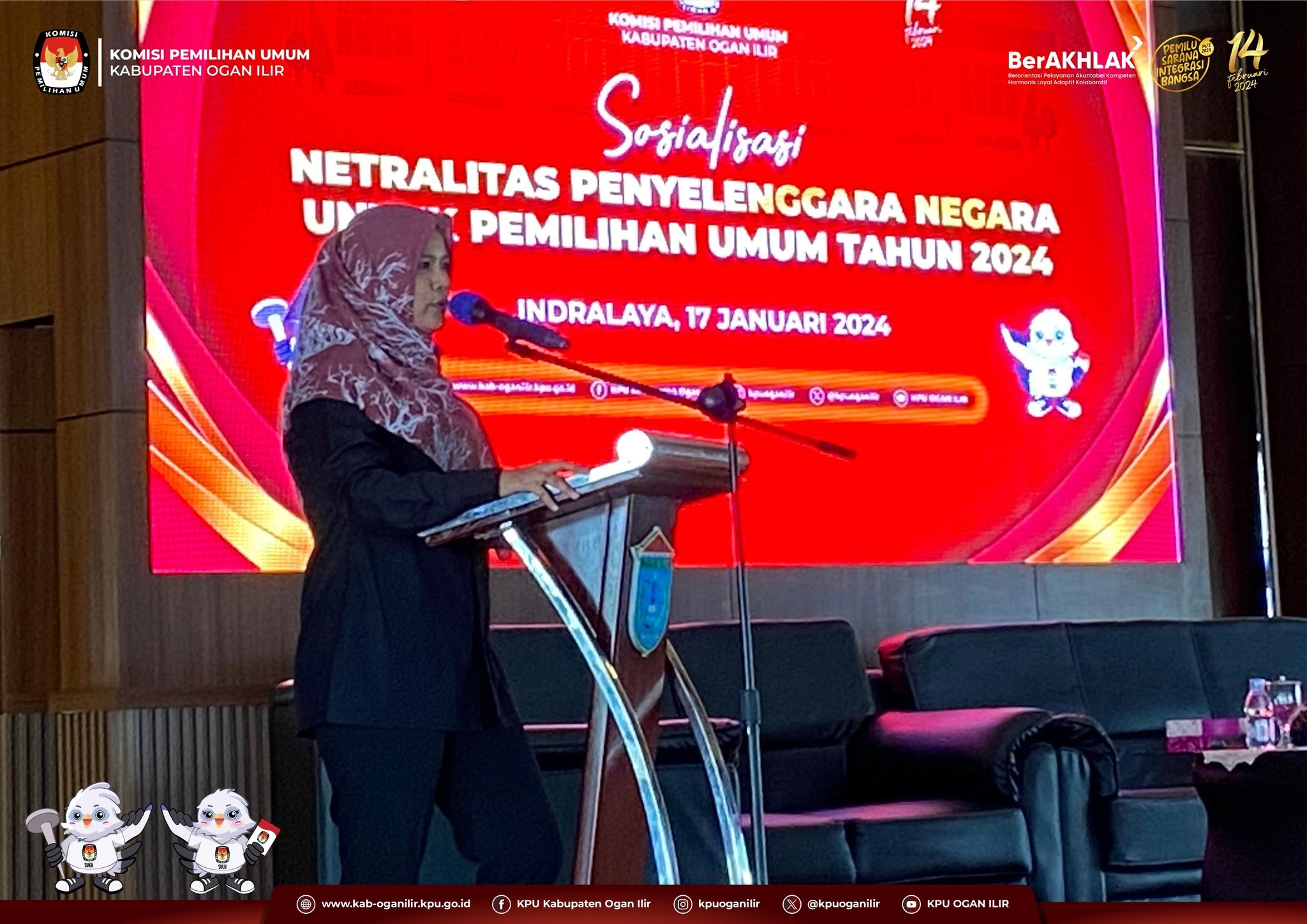 Ketua KPU Kabupaten Ogan Ilir Masjidah membuka kegiatan Sosialisasi Netralitas Penyelenggara Negara untuk Pemilihan Umum Tahun 2024 didampingi Anggota KPU Kabupaten Ogan Ilir Rusdi.