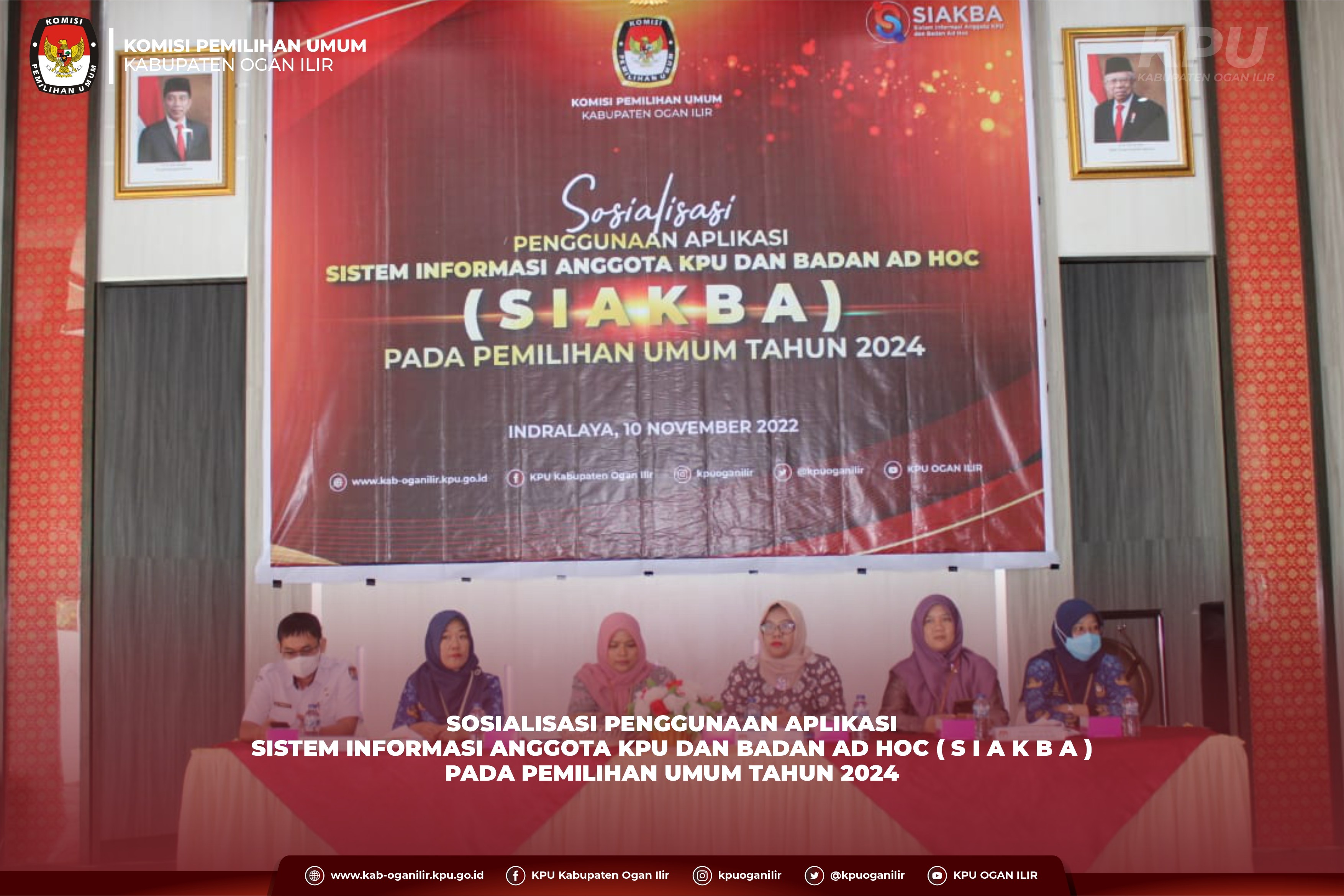 KPU Kabupaten Ogan Ilir melaksanakan kegiatan Sosialisasi Penggunaan Aplikasi Sistem Informasi Anggota KPU dan Badan Ad Hoc (SIAKBA) pada Pemilihan Umum Tahun 2024 di gedung serbaguna BPMP Sumatera Selatan dengan mengundang unsur Forkopimda, Lembaga Permasyarakatan, Camat se-Kabupaten Ogan Ilir, Tokoh Masyarakat, Organisasi Pemuda dan Media.