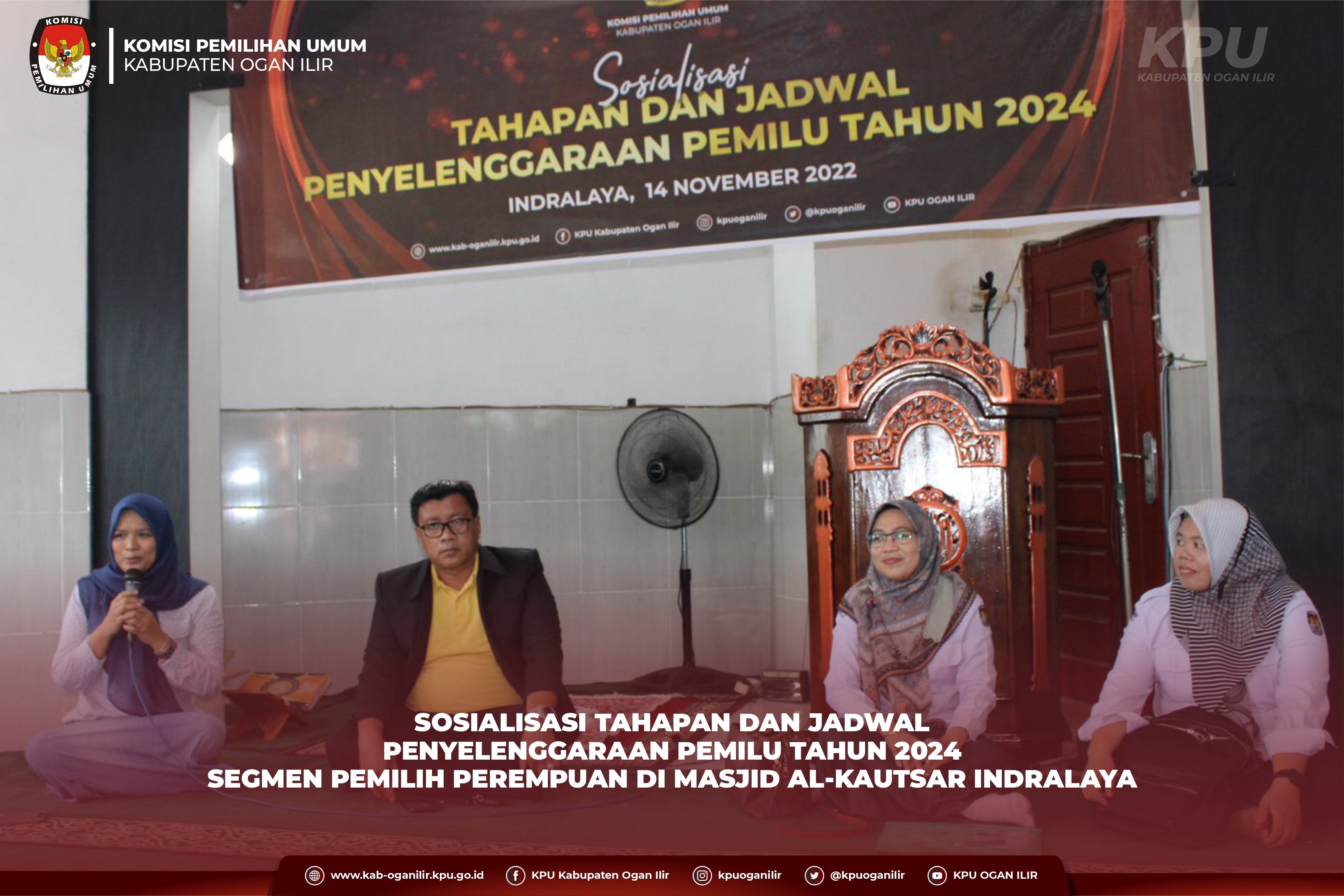 Melaksanakan tugas dan kewajiban sebagai penyelenggara pemilu, KPU Kabupaten Ogan Ilir menggelar kegiatan Sosialisasi Tahapan dan Jadwal Penyelenggaraan Pemilu Tahun 2024 Segmen Pemilih Perempuan di Masjid Al-Kautsar Indralaya.