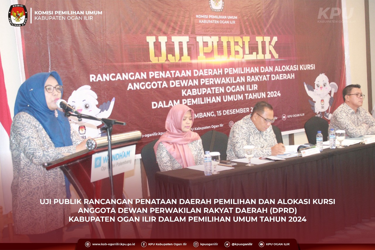 Komisi Pemiihan Umum Kabupaten Ogan Ilir menggelar Uji Publik Rancangan Penataan Daerah Pemilihan dan Alokasi Kursi Anggota DPRD Kabupaten Ogan Ilir dalam Pemilihan Umum Tahun 2024 (15/12/22) di Hotel Wyndham Palembang dengan mengundang 17 (tujuh belas) Partai Politik Peserta Pemilu Tahun 2024, Ketua Komisi I DPRD dan Anggota DPRD Kabupaten Ogan Ilir, Kapolres Ogan Ilir, Dandim 0402 OKI/OI, Tokoh Agama dan Masyarakat serta Awak Media.